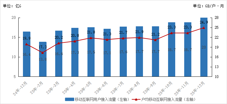 2025年,全省移动互联网接入流量达216.4亿GB,较上年增长16.1%。截至2025年底,移动互联网用户达8527.6万户,全年净增303.6万户。全年移动互联网月户均流量(DOU)达21.5GB/户·月,比上年增长12.0%,12月当月DOU达24.9GB/户·月,较上年提高5.0GB/户·月。
