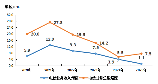 图1-1 2020—2025年电信业务收入和电信业务总量增长情况