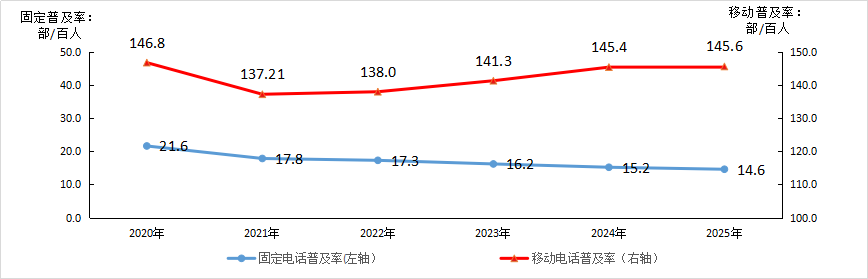 图2-1 2020—2025年固定电话及移动电话普及率发展情况