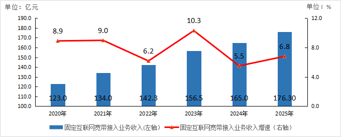 2025年,完成固定互联网宽带接入业务收入176.3亿元,比上年增长6.8%,在电信业务收入中占比由上年的14.0%提升至14.8%,拉动电信业务收入增长1.0个百分点。