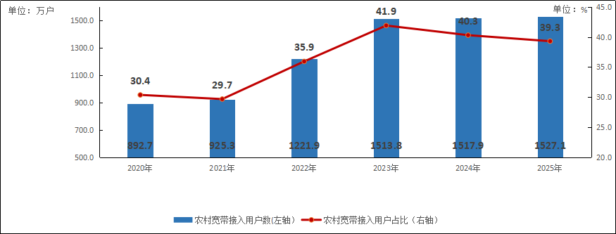 图2-4 2020—2025年农村宽带接入用户及占比情况