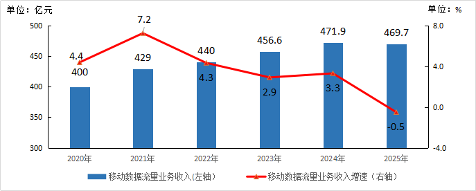 2025年,全省完成移动数据流量业务收入469.7亿元,同比下降0.5%,在电信业务收入中占比为39.4%。