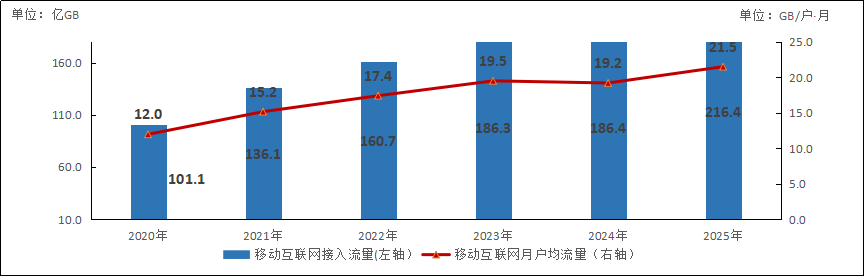 图3-1 2020—2025年移动互联网流量及月户均流量(DOU)增长情况