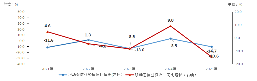 图3-3 2020—2025年移动短信业务量和收入增长情况