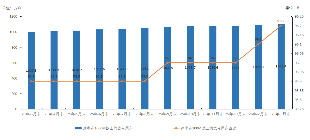 图2 2025年3月末-2026年3月末100M速率以上宽带用户占比、1000M速率以上固定互联网宽带接入用户情况