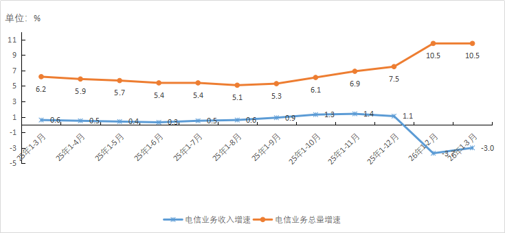 图1 2025年1-3月-2026年1-3月电信业务收入和电信业务总量累计增速