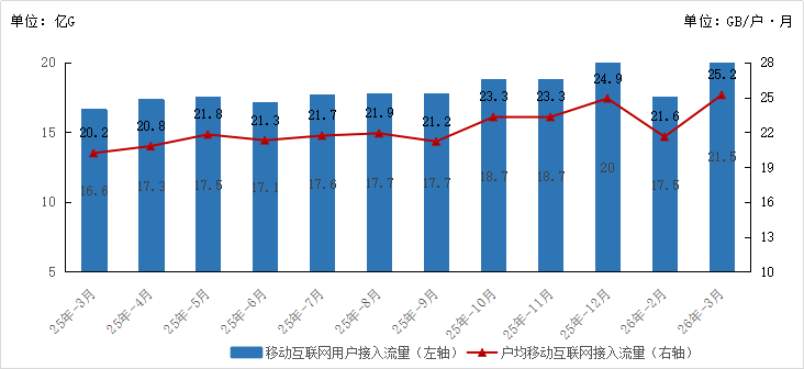 图4 2025年3月—2026年3月移动互联网接入月流量及户均流量(DOU)情况
